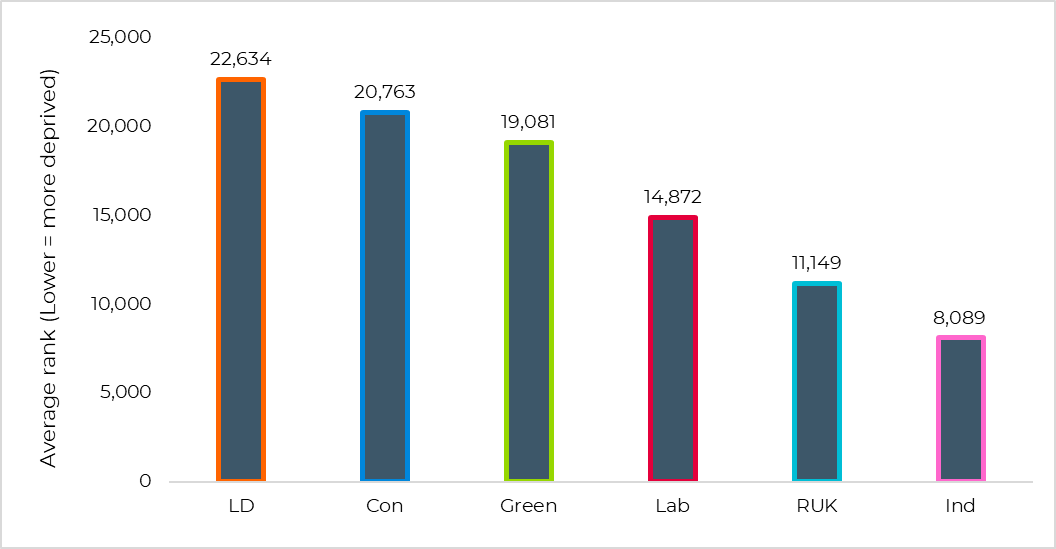 While there are only a handful of Independent, Reform UK and Green seats (five, five and four respectively), the data still highlights clear differences in deprivation levels across constituencies held by different political parties.
