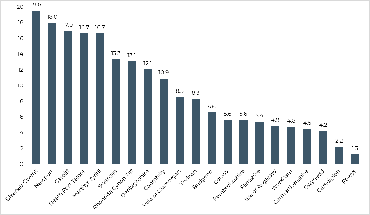 The chart below shows the proportion of each unitary authority’s LSOAs that fall within the 10% most deprived nationally, again highlighting how unevenly deprivation is distributed across Wales. In Blaenau Gwent, almost one in five LSOAs (19.6%) fall within the most deprived decile – nearly double the national benchmark of 10%. Newport (18.0%) and Cardiff (17.0%) also show particularly high concentrations, alongside Neath Port Talbot and Merthyr Tydfil, where around one in six neighbourhoods are among the most deprived.